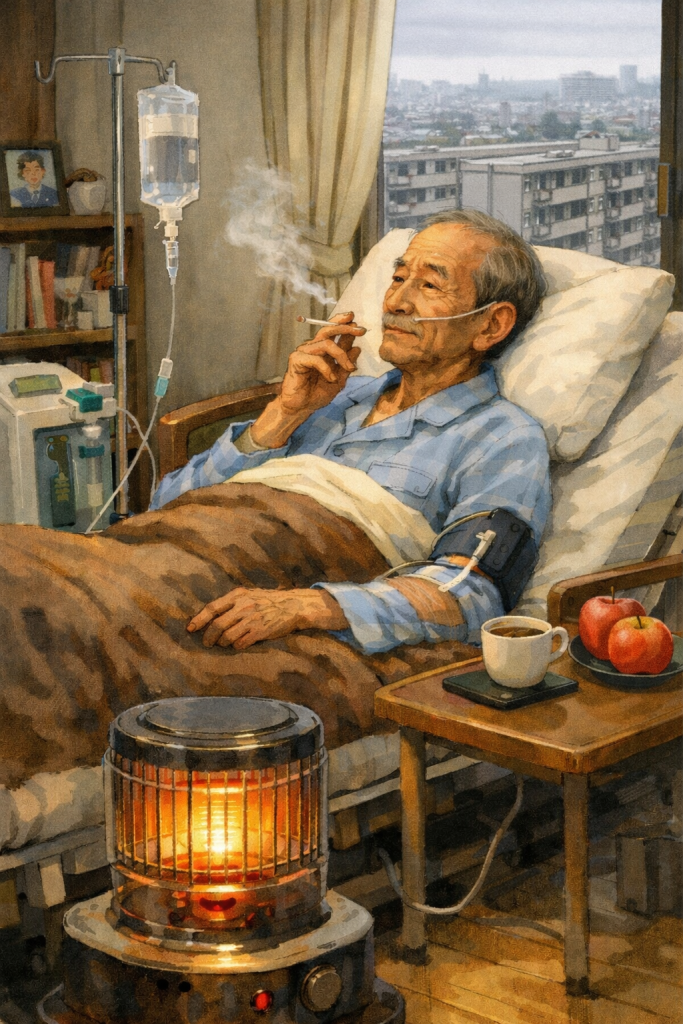 ⚠️在宅酸素療法では、室内に酸素が供給されています。酸素は燃えませんが、火がつくと燃え広がるスピードが非常に速くなります。酸素使用中は、タバコ、ストーブファンヒーターの至近距離での使用はNGです。大変危険です⚠️