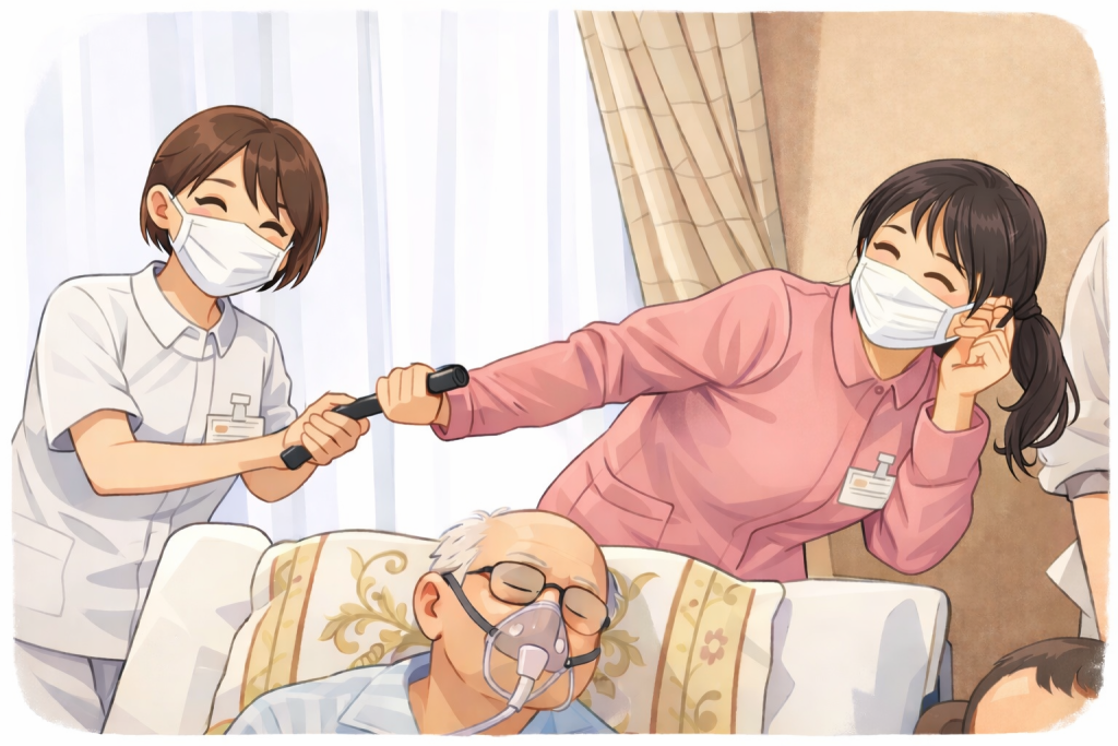 病院の緩和ケアナースとご自宅での記念撮影。しっかりバトンを受け取りましたよ☺️の写真をイラストにしました。