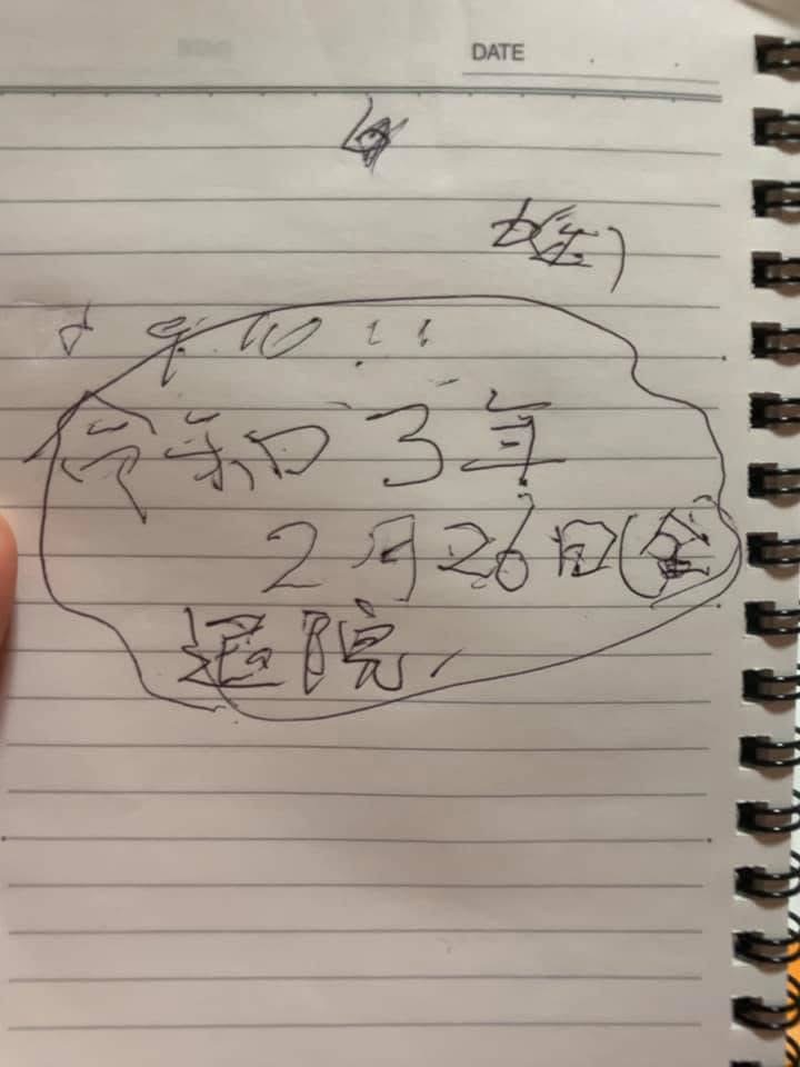 病室にお迎えに上がると、必死な思いで書いたメモが。