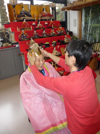 ☆あら!素敵!!☆株式会社ゆりかご2013年2月17日 先週からゆりかごでは、雛人形をかざり、毎年恒例の利用者さま変身!!が始まりました。 職員手作りの衣装に着替えます(=^▽^=) 専務の的確な指示のもと、着付けや写真のアングルなどこだわっております! 専務「もっと上!!」 職員「はい!分かりました!!」全ては最高の一枚を撮るためです。 着付けも終わり撮影開始!! カメラを向けると緊張してしまう利用者様達ですが、何枚か撮っていると慣れてくるのか自然な表情に変わってきます♪ 「娘に見せよう!!」とご満足して頂けました(●^▽^●)